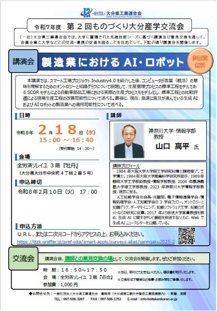 名誉教授・山口高平君が、2026年1月28日(水)に全労済ソレイユ(大分県大分市)で開催される「ものづくり大分産学交流会」において、「製造業におけるAI・ロボット」と題し、講演をおこないますのでご紹介させていただきます。(引用元:https://oitakenkoren.or.jp/news/249-6-2-3.html